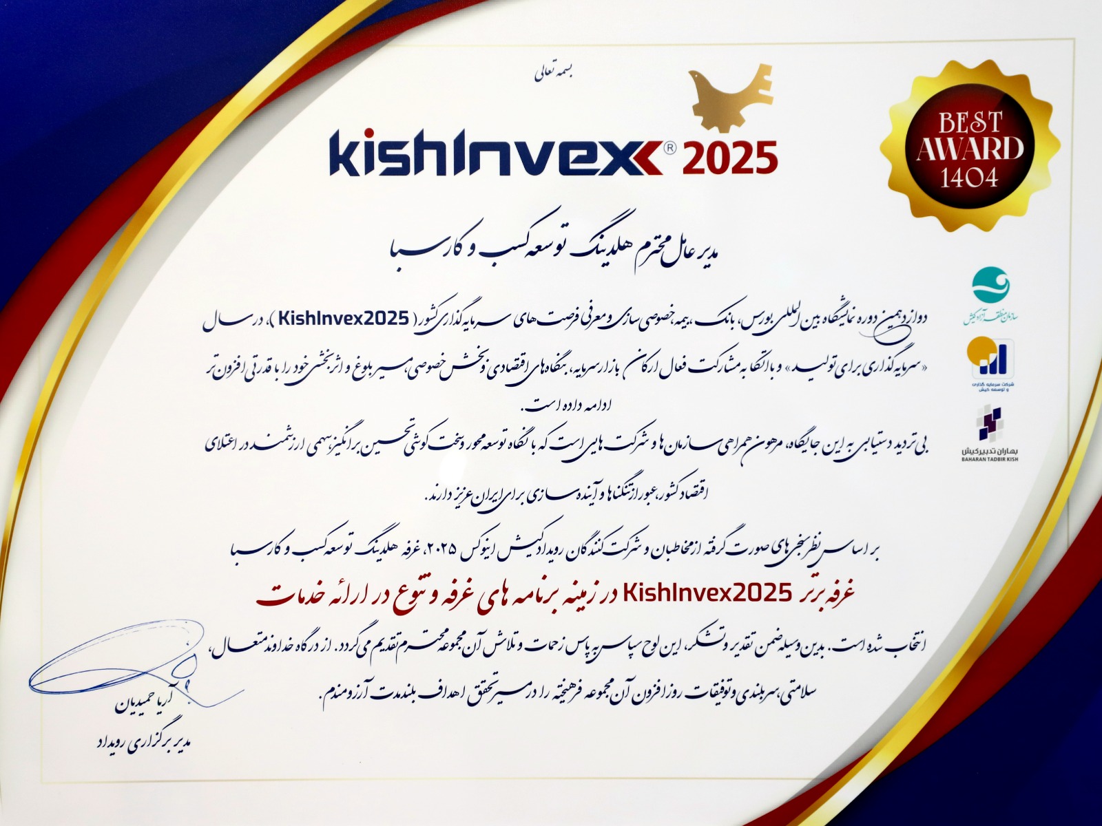 لوح افتخار غرفه برتر رویداد کیش اینوکس ۲۰۲۵ به دکتر محمدرضا جواهری تفتی اهدا شد.